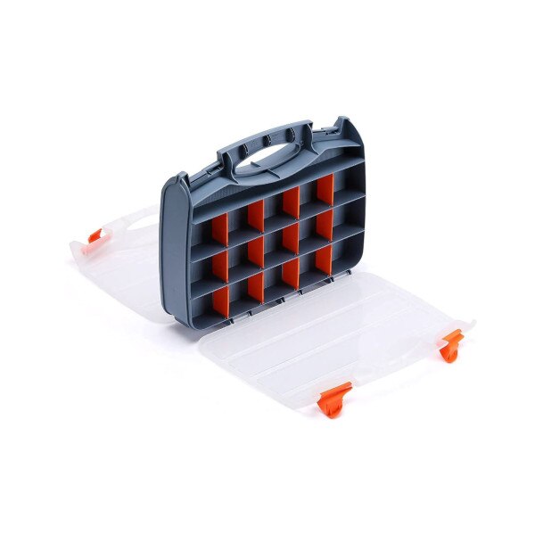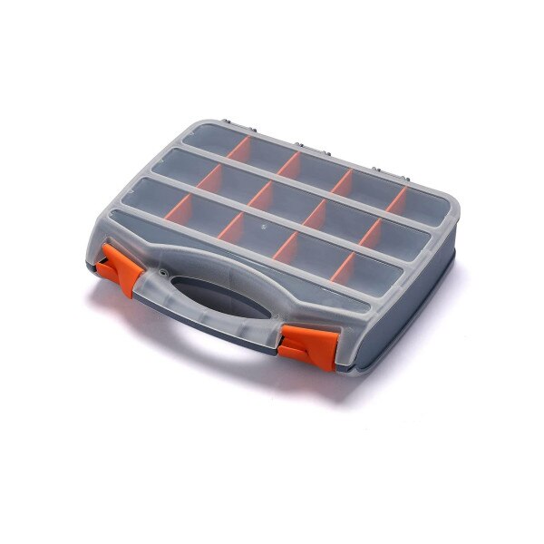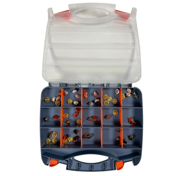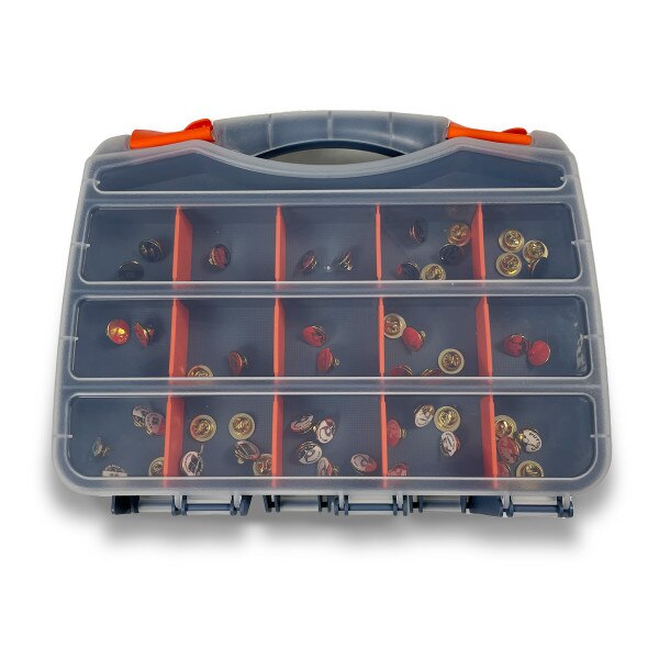 This multi-compartment storage box is made of high-impact materials and is sturdy and durable. Each side has 15 compartments, 3 rows are stationary and 12 dividers that are removable. Perfect for the five levels of the Player Pathway. The transparent covers allow you to see everything at a glance. It has two secure latches to keep everything in place. The overall size is 12.4 x 3 x 10.2 inches.